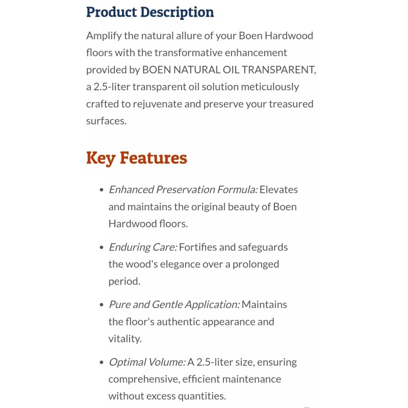 Enhance the natural beauty of your wood floors with Boen (A502S001) Natural Parquet Oil. This 2.5 liter container of oil is perfect for all types of wood floors and provides a quick drying solution for long-lasting results. The oil is designed to protect your floors from wear and tear, while also adding to their aesthetic appeal.