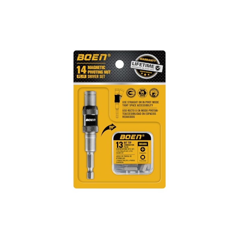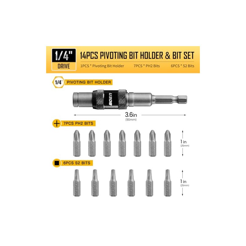 boen Pivoting Magnetic Bit Holder with Screwdriver Bits, Flexible Drill Bit Extension, 1/4-Inch SAE Hex Shank, for Impact Driver, Narrow Corners Use, 14PCS