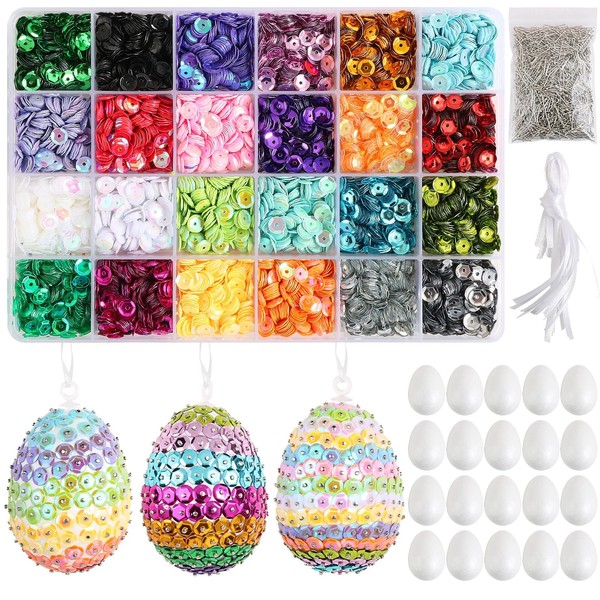 BOFUNX Styrofoam Eggs Craft Set, 24 Easter Eggs for Hanging + 24 Colour Sequins and Pins String for DIY Sequins Easter Eggs Crafts Children Easter Gift