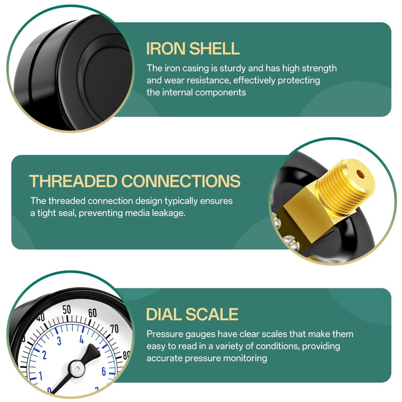 - [MATERIAL FEATURES]Iron housing, corrosion-resistant, brass wetted parts suitable for measuring the pressure of non-corrosive liquids and gases.
