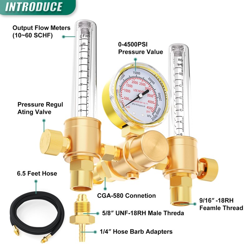 • [Highly Compatible Interface] CGA580 imported fittings for standard argon cylinders, 5/8" x 18RH outlet threads for versatility, directly matching most TIG/MIG welder hoses.