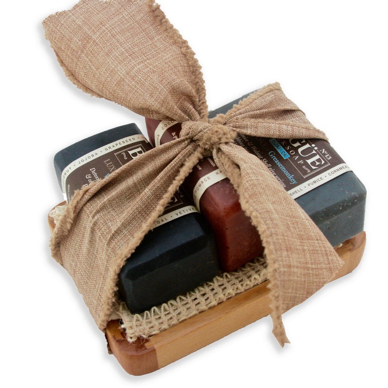 Goat Milk Soap Bearded Greasemonkey Giftset- BOGUE No.14 Beard Wash, No.13 Exfoliating Grease Monkey 3 Aggregates Remove Grime No.4 Activated Charcoal Detox, Cloth & Tray