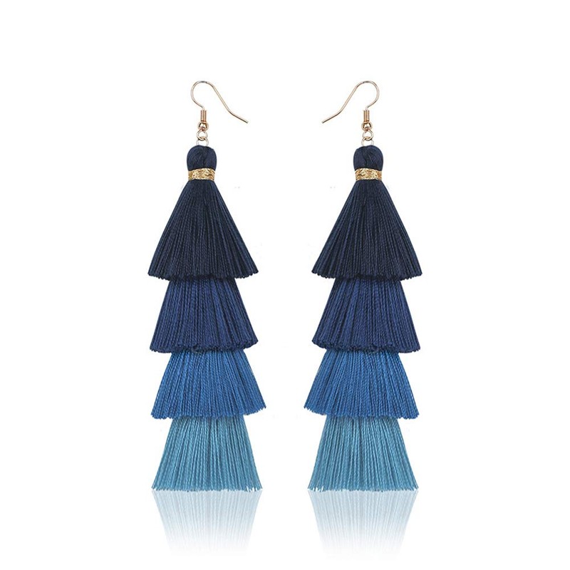 Bohemian Layered Long Pom Pom Tassel Earrings Drop Dangle Tiered Ombre Fringe for Women (Royal Blue)