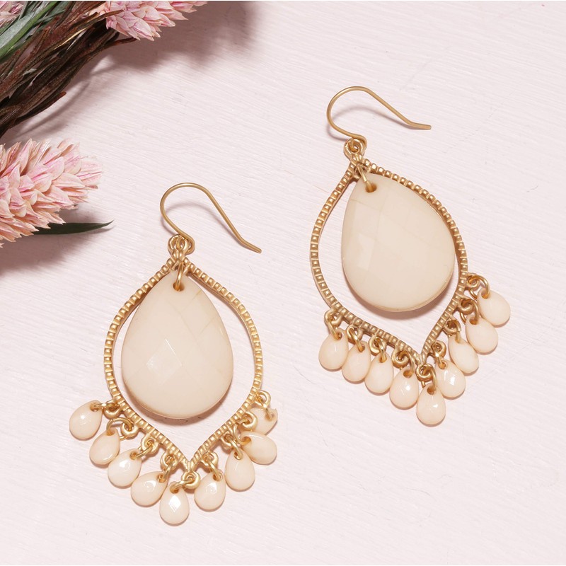 - These chandelier tassel earrings are both basic and stylish, and they're inspired by the third eye chakra. The brass frame is plated with a luxurious vintage matte gold color, adding a touch of elegance to the design. The beads tassels are swingy and create a beautiful effect with your movements, making them perfect for any occasion. This boho chic earring is an essential addition to your wardrobe, featuring everything from casual to sophisticated looks.