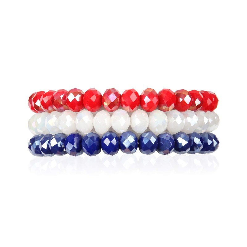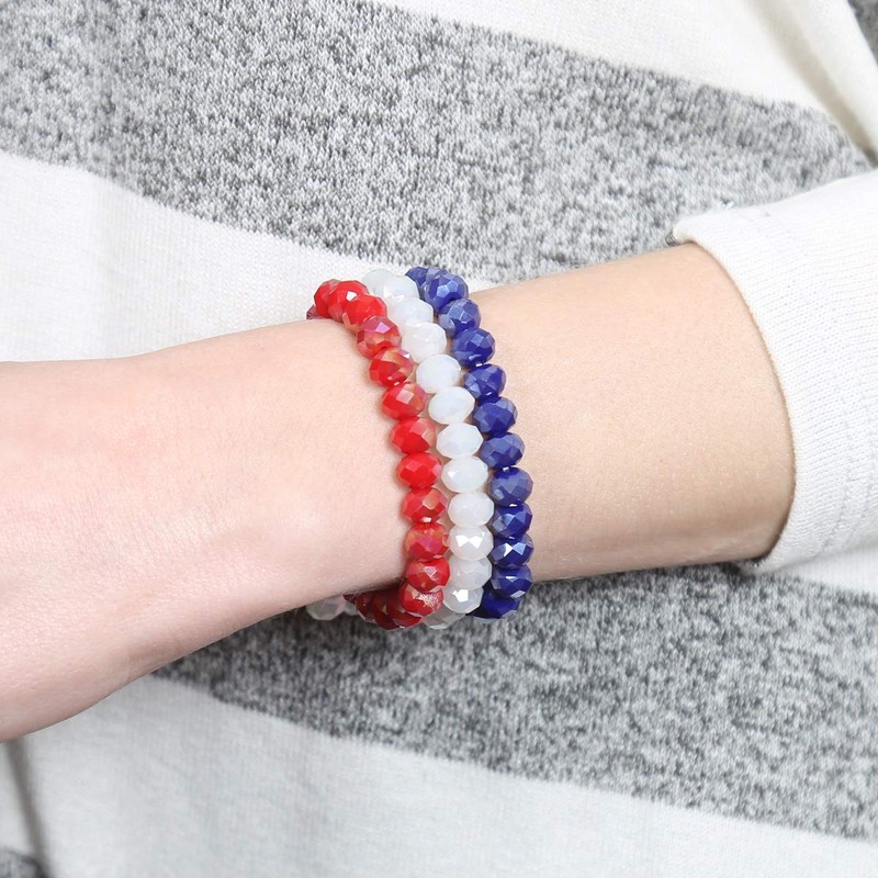 Bohemian Multi-Layer Beaded Stacking Bracelets - Versatile Stretch Strand Sparkly Crystal Beads Statement Wrap Slip-on Cuff Bangle Set (Sparkly Mix - USA Flag Iridescent)