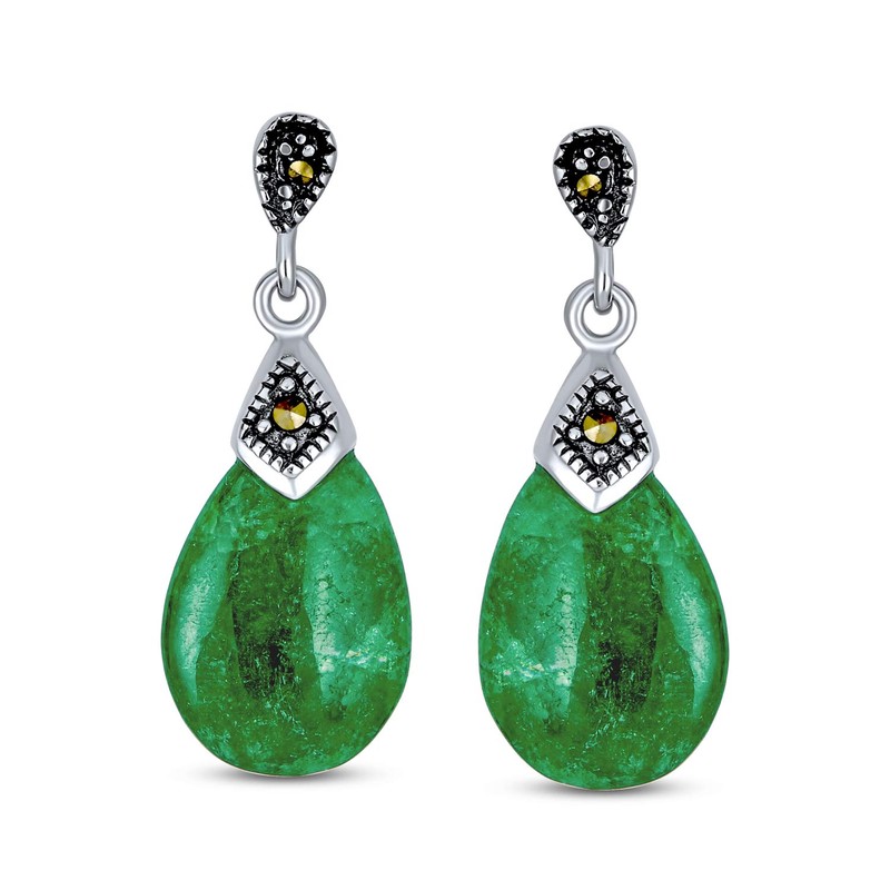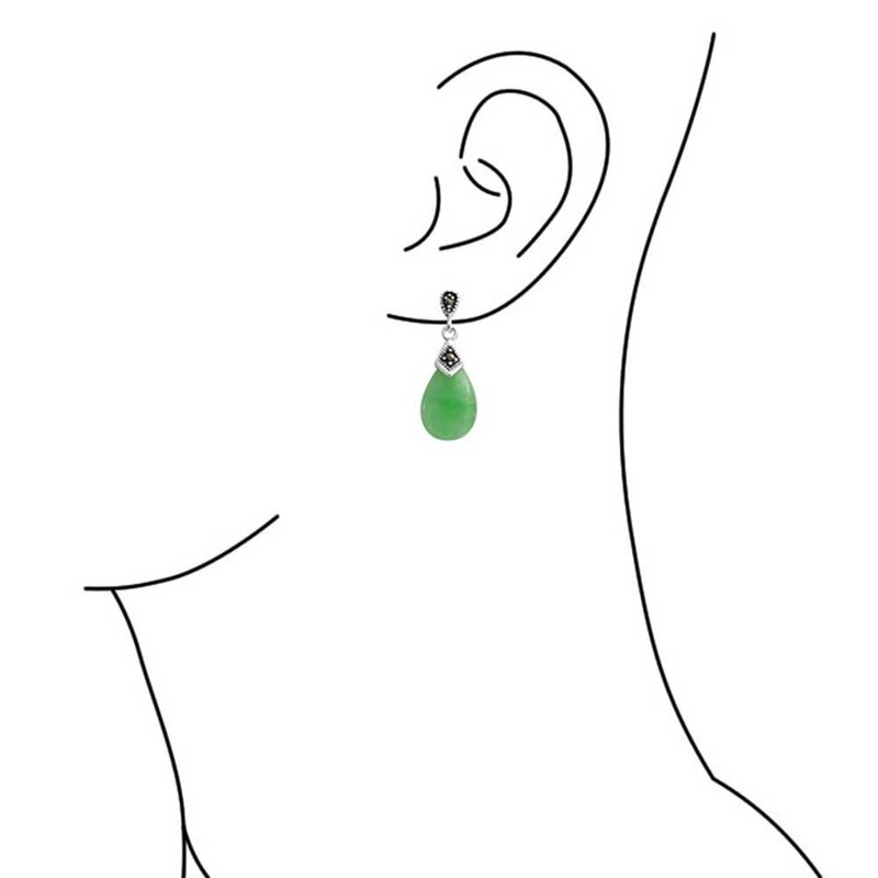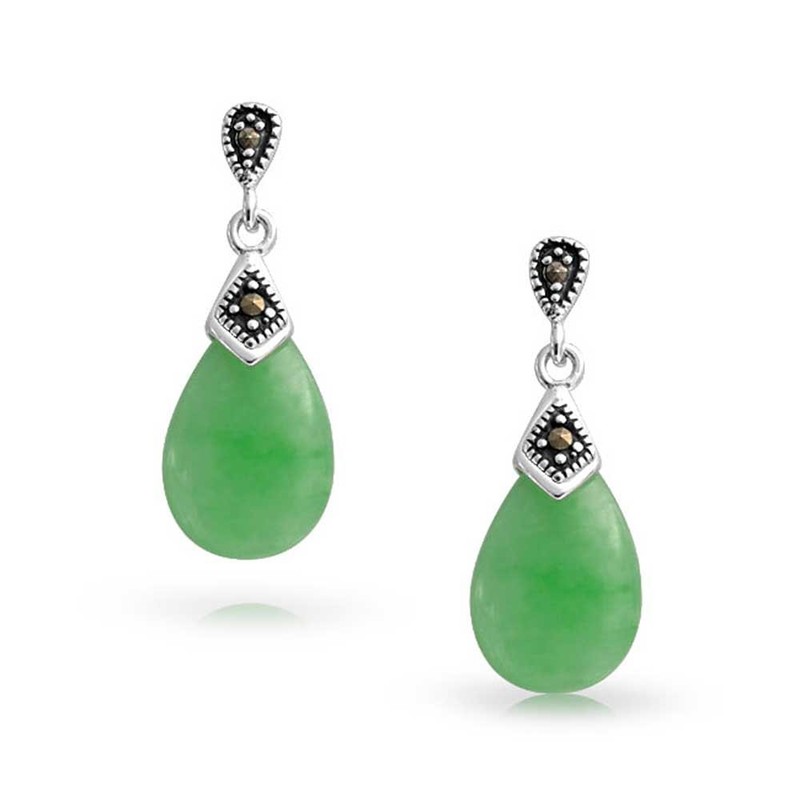 Boho Bali Marcasite Akzent Birnenförmig Edelstein Kronleuchter Baumeln Träne Echte Grüne Jade Tropfen Ohrringe Für Frauen Zwei Ton Oxidiert .925 Sterling Silber
