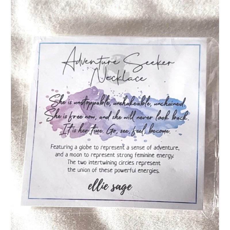 "Featuring a globe to represent a sense of adventure and a moon to represent strong feminine energy, the two interwining circles represent the union of these powerful energies." Very pretty.