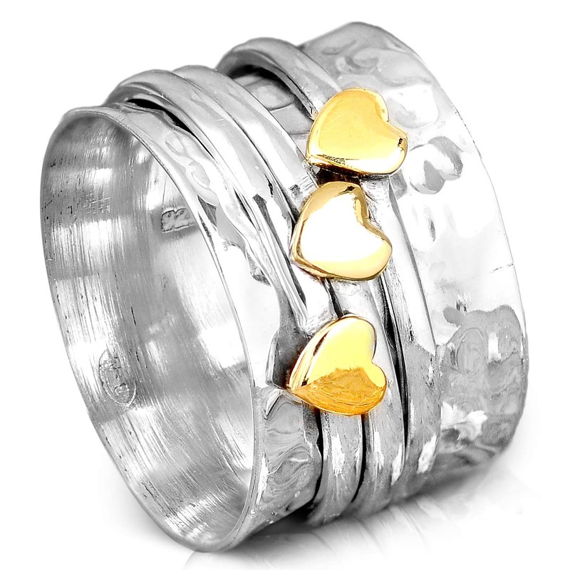 - SPIN FREELY, SMOOTH AND COMFORTABLE - Comfort fit with no sharp edges, Made of hammered 925 Sterling Silver (Stamped) with three silver spinning bands and hearts made of brass.