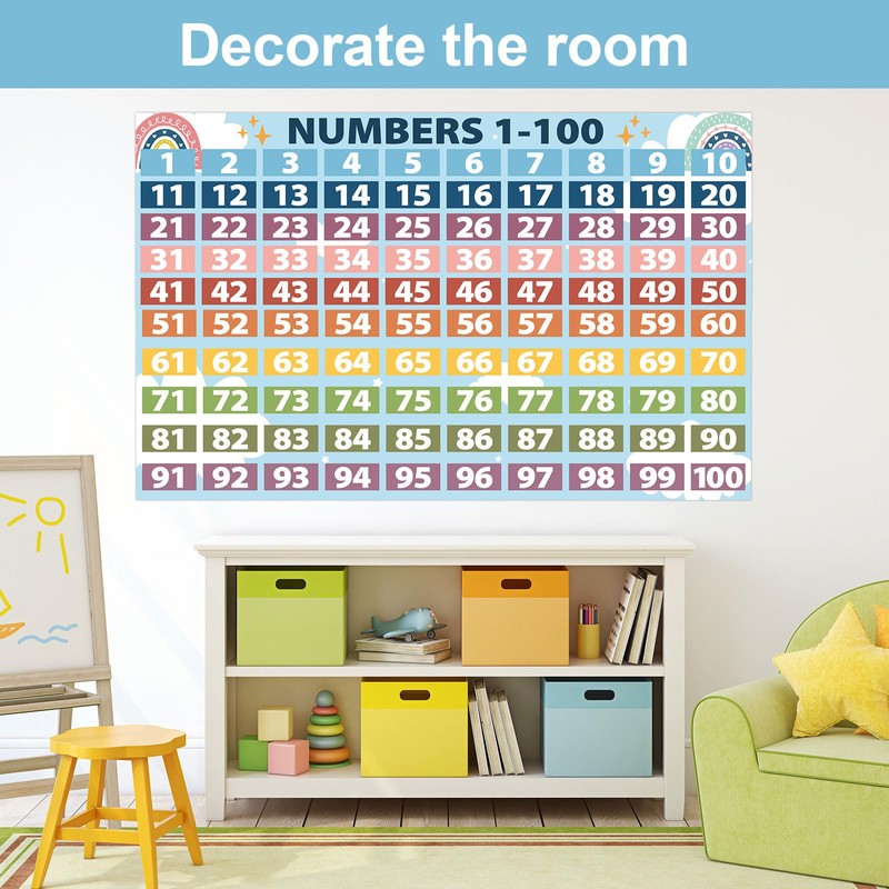 - 【Large size numbers bulletin board】The continuous number line decor from 1 to 100, comes with 2 pieces decoration, each border strip measures about 39” x 13” (99cm x 32cm),Putting up the decor on the wall or blackboard will make the numbers learning and counting become easy, students’ interest and attention will be aroused greatly.The boho rainbow posters providing a fun visual reference and study method for math learners.
