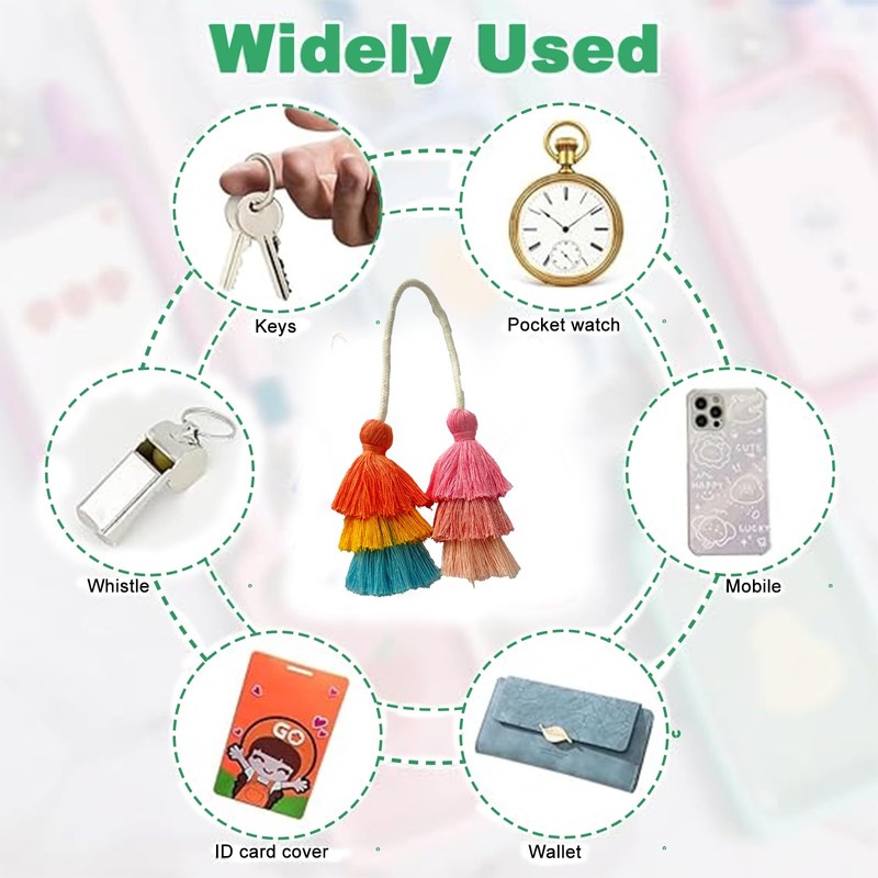 - Lebendige und strukturierte Ästhetik: Weiche, flauschige Quasten und komplizierte Pom-Pom-Details sorgen für visuelles und taktiles Interesse. Die kräftige Farbpalette setzt ein Statement und wertet Taschen, Gepäck oder Armbänder sofort auf.
