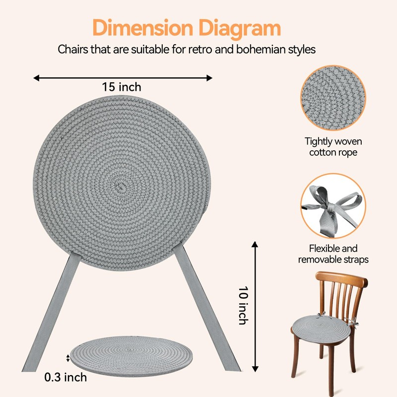 Versatile Comfort & Style: Crafted from soft cotton rope with a tightly woven design, these 15"x15" round chair pads add cozy texture and visual charm to any boho, farmhouse, or rustic decor. Their non-slip backing and tie closures keep them securely in place, making them ideal for dining chairs, kitchen benches, or classroom seating—indoors or out.