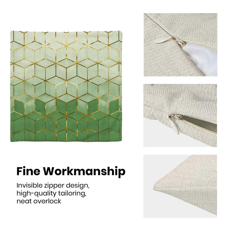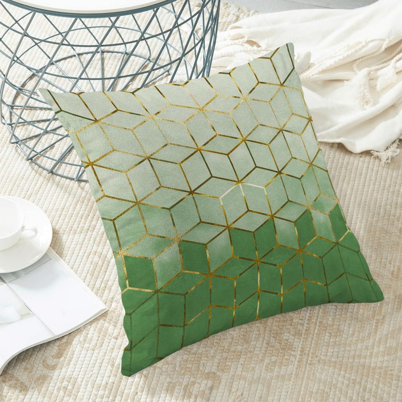 Don't forget about the size! Our sage green gold cubic throw pillow covers measure 18x18 inches, providing the perfect fit for standard-sized pillows.