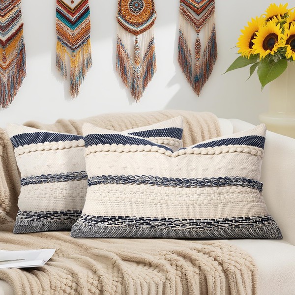 Boho Throw Pillow Covers 20 * 12 Inch Set of 2 Decorative Accent Pillowcase Farmhouse Bohemian Neutral Textured Cushion Cover for Couch Sofa Bedroom Living Room (Navy, 20 * 12)