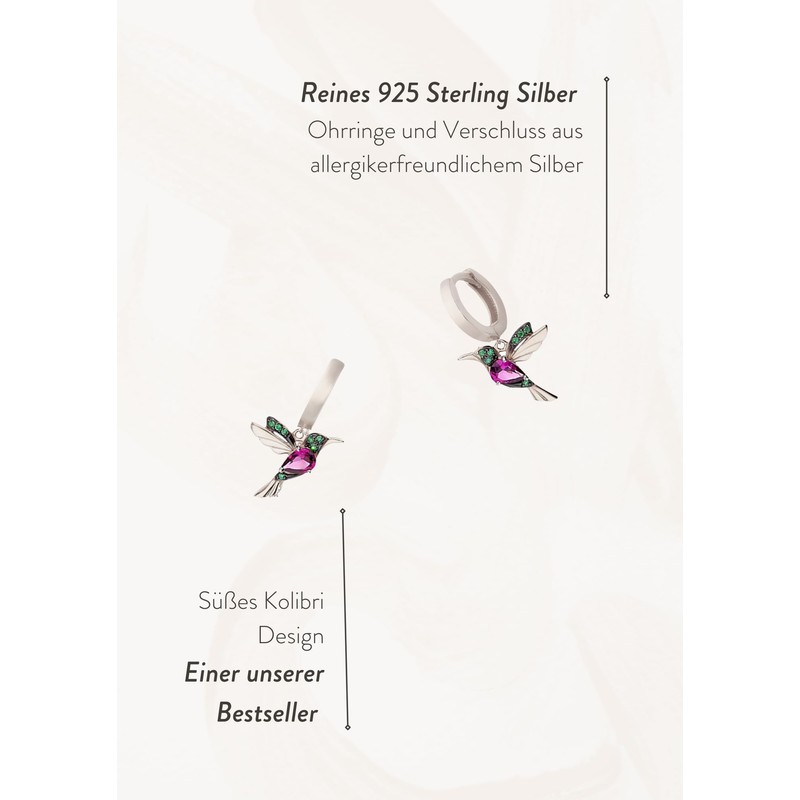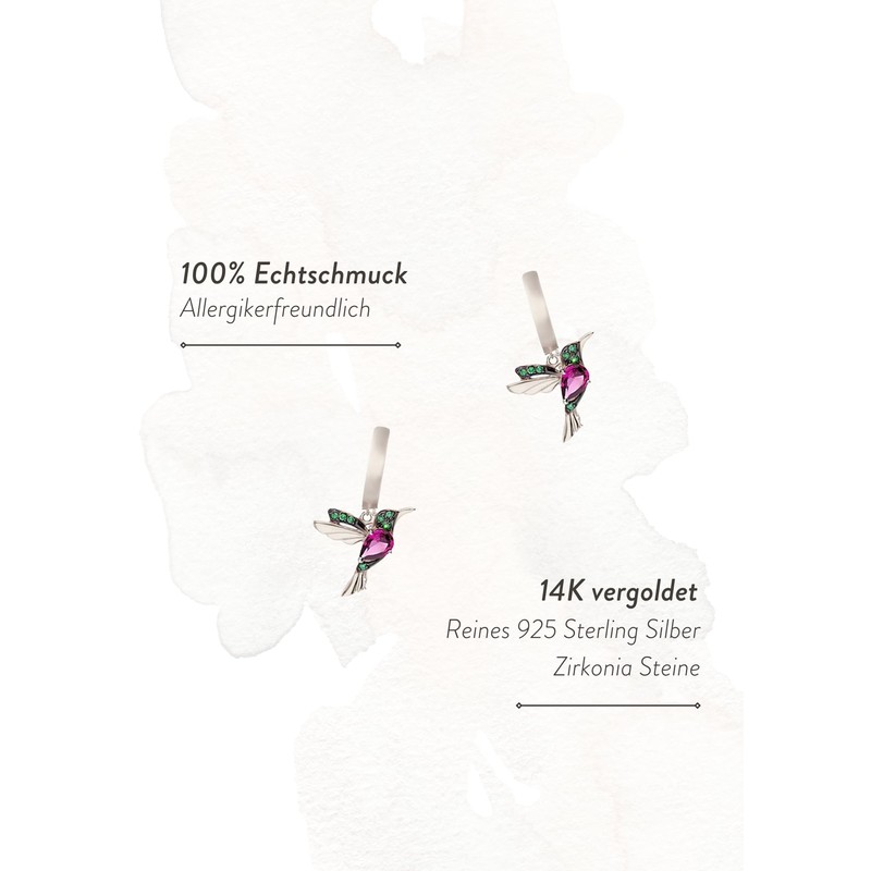 BOHORIA Einzelstück® Mini Hoop Earrings Hummingbird Hoops I With zirconia stones green and purple I Silver Earrings I 925 Sterling Silver I Antiallergenic & nickel-free (Silver)