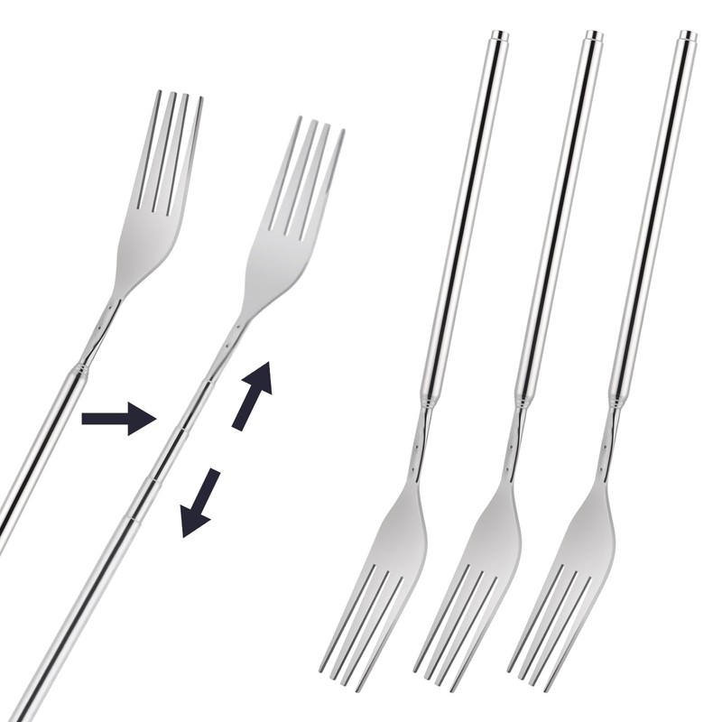 - 【Easy to Use】The extended fork is designed with a smooth and ergonomic grip. The telescopic fork is very easy to stretch and retract. It is the size of a regular fork when retracted, can be stored in the kitchen, and outdoor activities can also be easily stored in backpacks and organizers. You can easily fork food when stretched while staying away from heat sources to prevent burns.