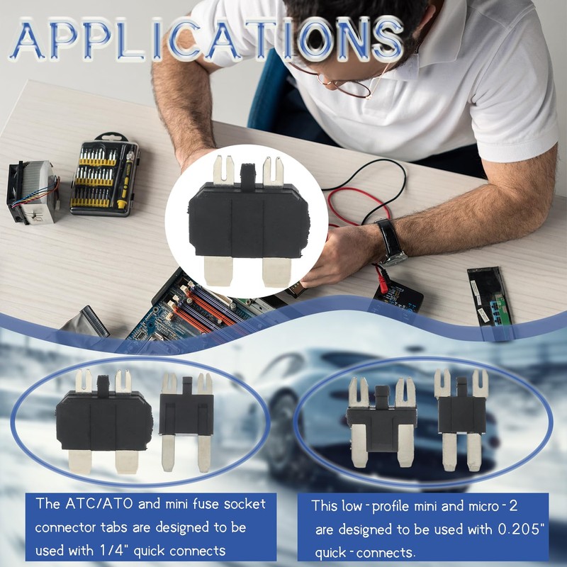 - 【Connector tabs】The ATC/ATO and mini fuse socket connector tabs are designed to be used with 1/4" quick connects, and low-profile mini and micro-2 are designed to be used with 0.205" quick-connects.