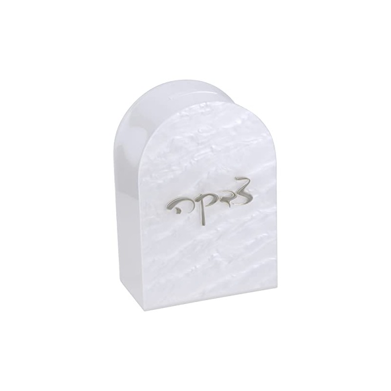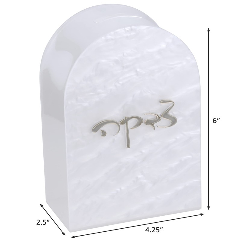 - PEARL LUCITE TZEDAKAH BOX - Enhance the mitzvah of giving charity with this beautiful designed pearl lucite tzedaka box.