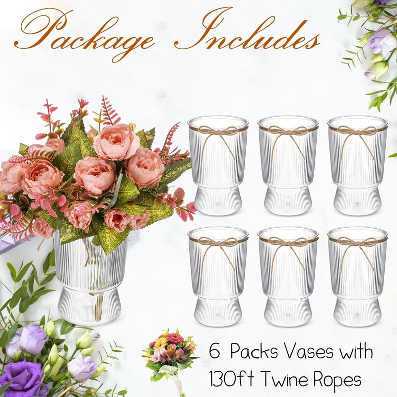 Bokon 6 Pack 6 Inch Small Plastic Clear Vases for Table Centerpieces Vase Bulk for Wedding Table Decorations Flower Aesthetic Plant Propagation Requires Assembly with Twine (Clear)