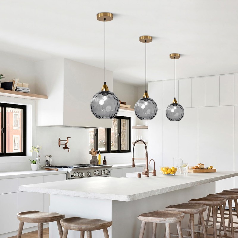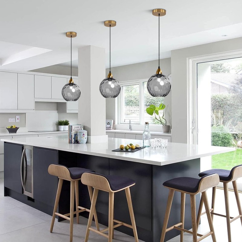 - 【Vintage Smoke Grey Glass Lamp Shade】The kitchen island pendant lights has a sleek gold metal finish and a distinctive smoke gray glass globe shade, handmade glass shade simplistic and tasteful, makes it stand out in any home.The adjustable cord ceiling pendant lamp fits perfectly with any style decor from modern to the farmhouse.