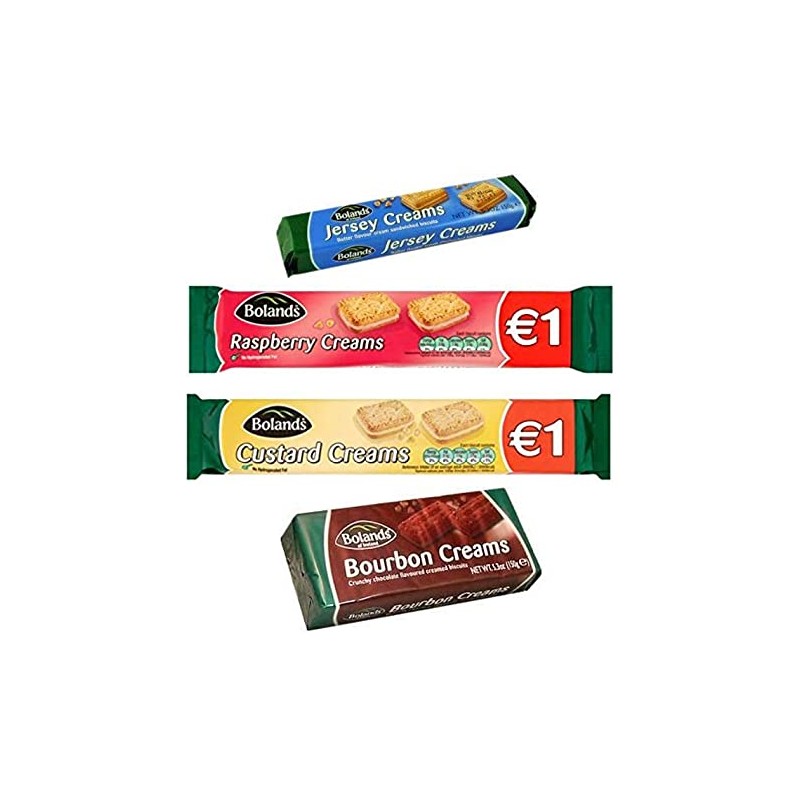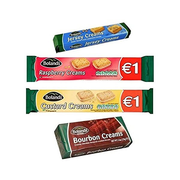 Bolands Creams Multi-Flavor Pack, Custard, Raspberry, Jersey, Bourbon, Ireland, Pack of 4, 125g each