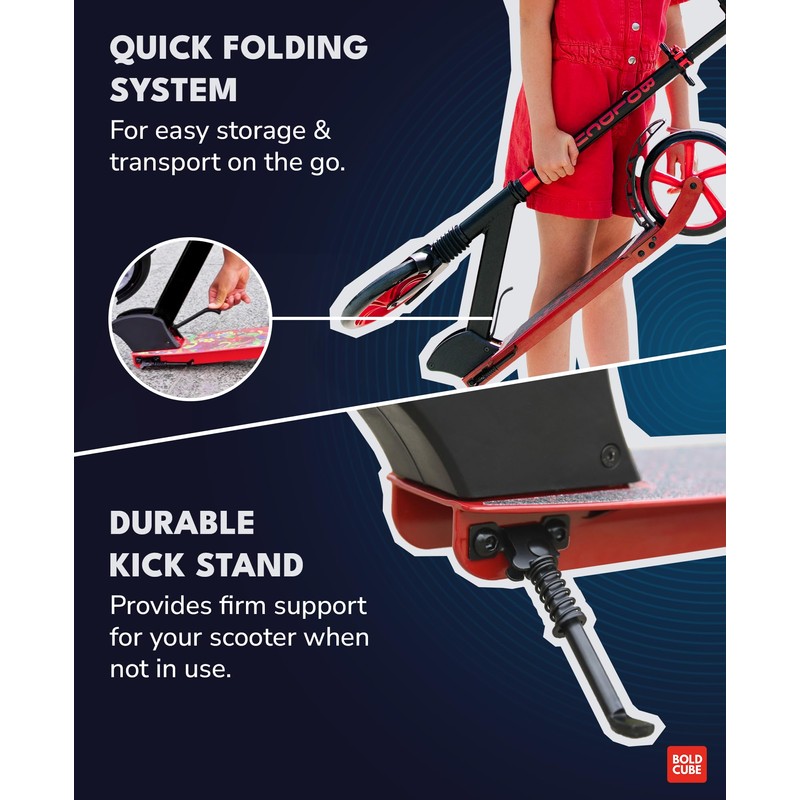 - FAST FOLD – The fast folding scooter lever offers quick and simple opening and closing of the kids scooter. Simply pull the lever down and your big two wheel scooter will fold / unfold. When you’re ready to store the scooter away the handlebars also fold down for more compact carry or storage size.