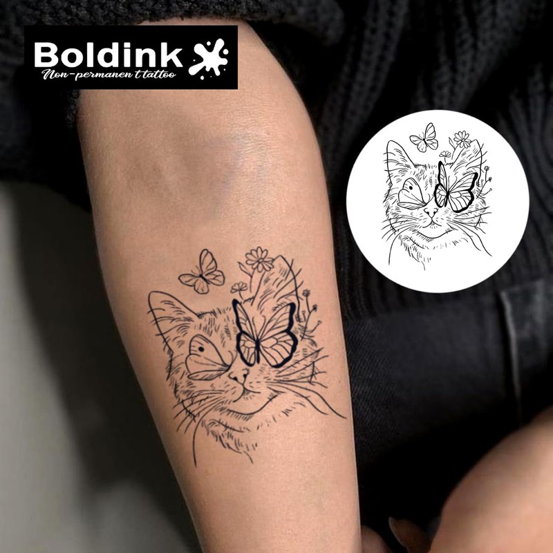 Boldink Temporary Tattoos, semi permanent tattoos, 15-day long lasting tattoo sticker, waterproof and anti-reflective, unique design(Butterfly and Cat)