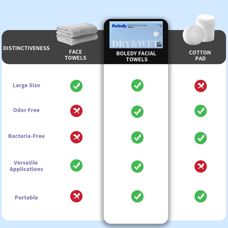 Boledy Soft Facial Towel – Experience Luxury in Your Daily Routine Transform your daily skincare and makeup removal routine with Boledy Soft Facial Towels, the ultimate disposable face towels designed for your comfort and convenience. At Boledy, we are committed to enhancing your everyday experiences through high-quality products crafted from natural materials. Our face wipes are not just ordinary towels; they are a testament to our dedication to quality and softness. Made from the finest cotton, Boledy Soft Facial Towels provide an incredibly gentle touch that caresses your skin, making them perfect for all skin types. Whether you’re wiping away makeup, refreshing your face, or needing a quick fix, our superior face cloths ensure a luxurious experience with every use. Upgrade your skincare game with Boledy Soft Facial Towels – the perfect combination of convenience, functionality, and eco-friendliness. Don't settle for less; choose Boledy and elevate your beauty routine today!