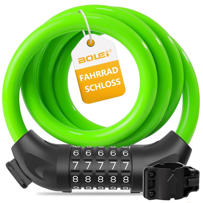 BOLEi Bicycle Lock with Combination Code 12 mm/120 cm, Anti-Theft Bicycle Cable Lock with 5-Digit Code Combination, Waterproof Combination Lock Cable for Bicycle, E-Bike, Pram, Ladders, Grills (Green)
