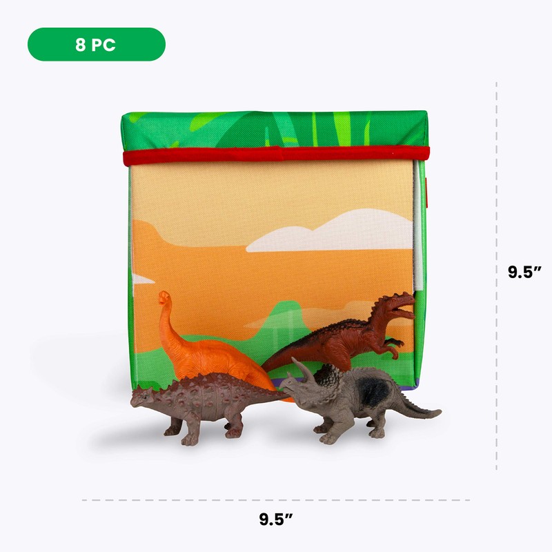 • WHAT'S INSIDE: Our exclusive Dino Play Mat and Toy Storage Box is a bundle of joy! Comes with an adorable, double-sided canvas play mat that folds into a toy bin with handles and a lid. Holds the included 4 dinosaur figurines, coloring book, and hardcover picture book with room to spare!