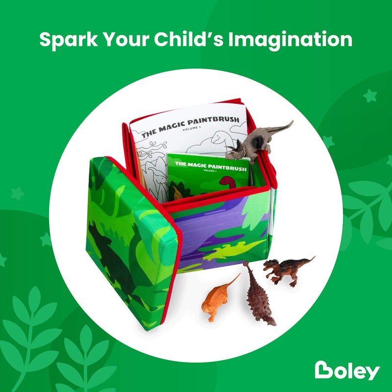 • DINO HAVEN: Turn your playroom into a magical dinosaur land with our playset and sweet story, The Magical Paintbrush, in full color with contemporary illustrations. Then, get creative with the black and white coloring book version! Coloring supplies not included.
