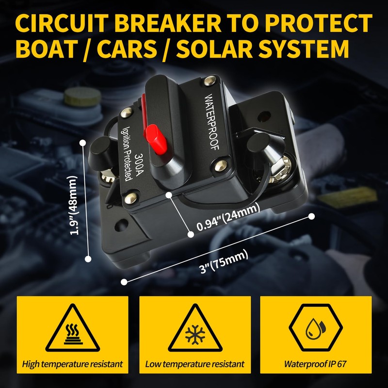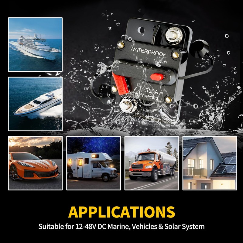 - 【Specification】: 300 Amp Circuit Breaker 12v, Operating Voltage: DC 12V - 48V, Waterproof IP 67, Meet S.A.E. J1625, J1171, UL1500 (Ignition Protected). Widely used in marine and automotive circuits, suitable for Boat, Yacht, Kayak, RV, Trailer, Bus, Truck, Winches, ATV, solar system etc.