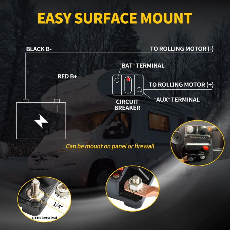 - 【Easy Surface-Mount】: Bolipoeq 12v dc circuit breaker is surface-mount design, simply mount them on panel or firewall, hassle-free installation. What you get: 4 x auto 300 amp Breaker, 8 x Wire Lugs, 16 x Washers, 12 x Mounting Screws.
