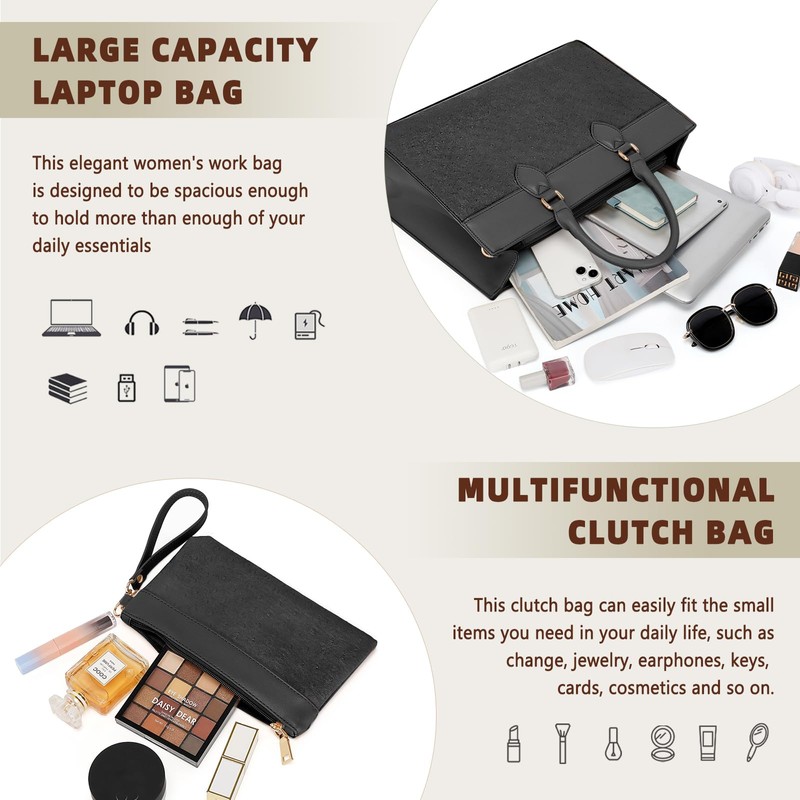 BOLOSTA Laptop Bag for Women 15.6 inch Laptop Tote Bag Large Capacity Waterproof Leather Work Bag with Clutch Purse (Black)