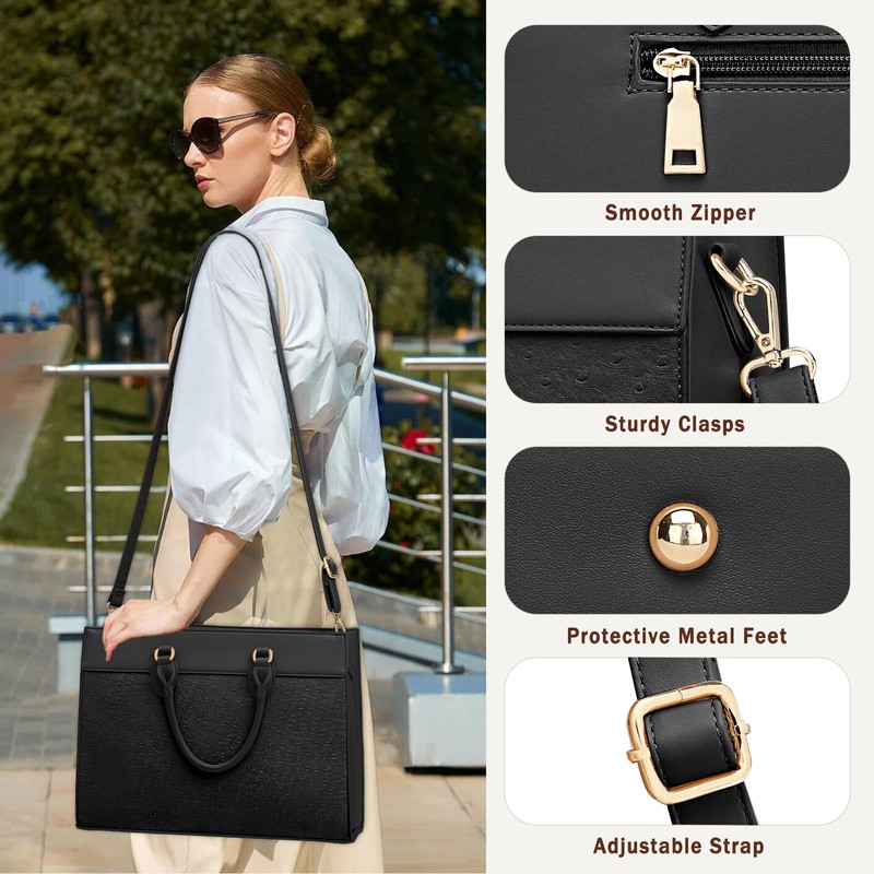 - Elegant & Stylish Design: Women's laptop bag is a perfect combination of high quality waterproof leather and polyester fabrics with a sleek metal design ,stylish and elegant. The ostrich print design on the front adds a stylish and unique touch to the bag. Whether you need a laptop bag or a large tote bag for when you're out and about, this versatile work bag will add elegance to your closet.