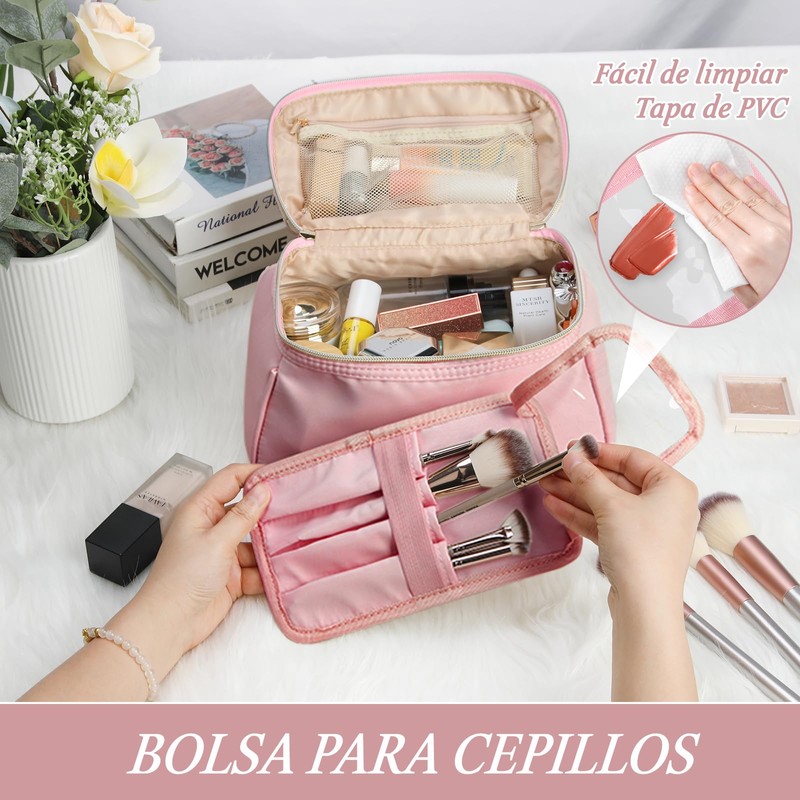 - ECESER PORTÁTIL:Diseñado con un asa cosida reforzada en la parte superior,este bolsa de maquillaje para mujer se puede utilizar como neceser portátil .Neceser de maquillaje con un compartimento muy abierto y un diseño de apertura y cierre de 180 grados.Esta bolsa de maquillaje de viaje no solo te permite guardar tus cosméticos o artículos de tocador a la vez,sino que también te ayuda a colocar y recoger tus artículos más fácilmente
