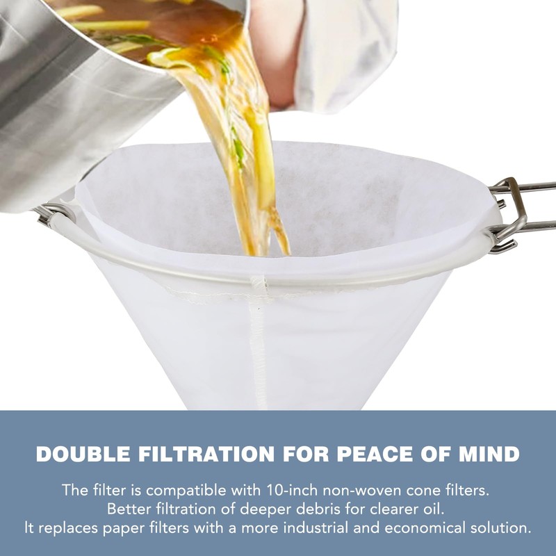 Bolsa de filtro de cono reutilizable de 10 pulgadas para freír aceite, con brazos plegables para fijar a freidoras, soporte de filtro de aceite de cocina, soporte de filtro de cono de jarabe de arce, construcción duradera, fácil de limpiar