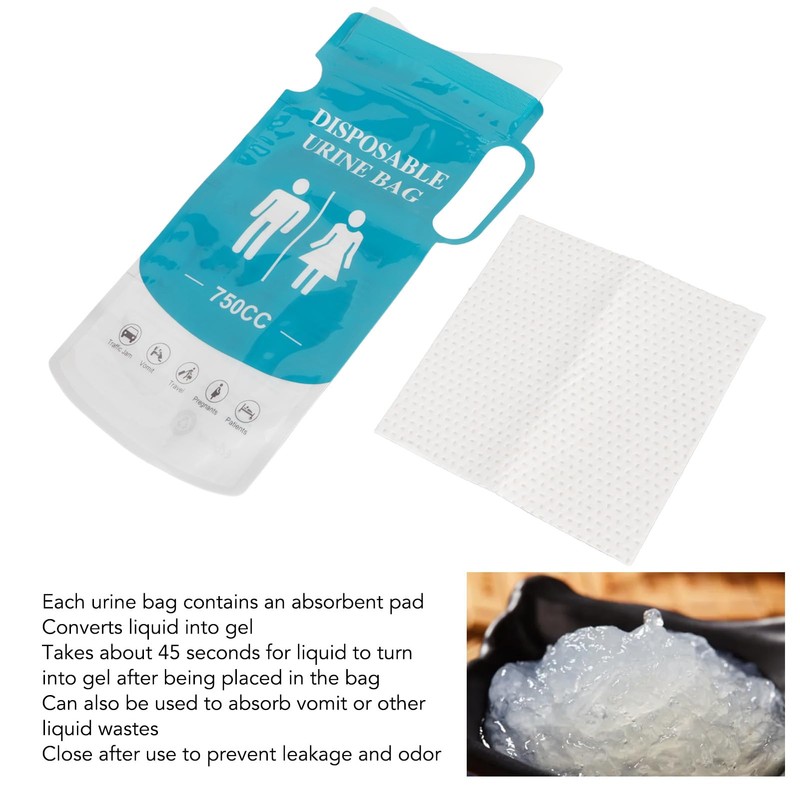 - [Convierte líquido en gel] Cada bolsa para orina contiene una almohadilla absorbente que convierte el líquido en gel. El líquido tarda 45 segundos en convertirse en gel después de colocarlo en la bolsa. También se puede utilizar para absorber vómitos u otros desechos líquidos.