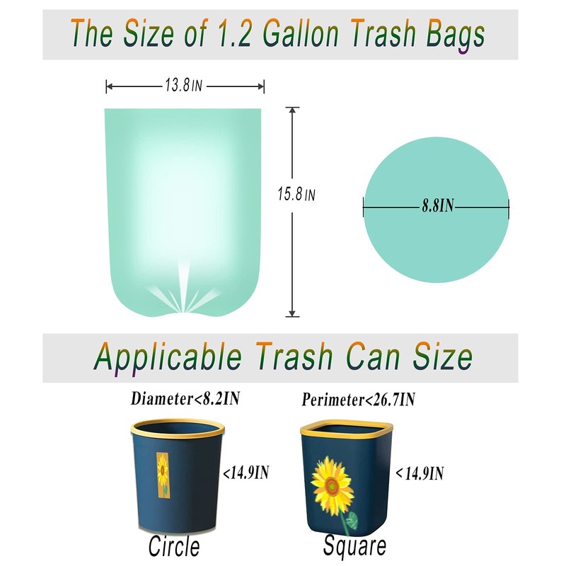 - Ampliamente utilizado: nuestras bolsas de basura mejoradas de 1.2 a 2 galones son ideales para cubos de basura pequeños en el baño, la oficina, la sala de estar, el dormitorio y la cocina.
