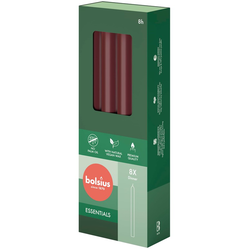- Check out the revamped Essentials collection! The Bolsius smooth dinner candle in the colour Velvet Red is 23 cm tall, with a burn time of 8 hours. Crafted with passion for people and the planet, using natural vegan wax and palm oil free. The collection includes elegant candles in a range of sizes and colours, which can be effortlessly combined with each other. A valuable addition for every interior!