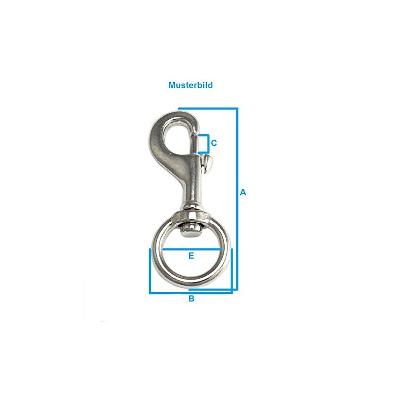 - Bolt carabiner with round swivel, length: A 82 mm, width: B 32 mm, opening: C 10 mm, swivel inside: E 22 mm, material: pure brass, 3/4 inch, weight: 57 g, quantity per sales unit: 1 piece