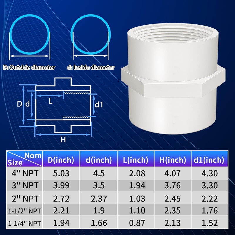 • 【PVC Outdoor Pipe Fitting】These furniture grade PVC thread pipe fittings are suitable for indoor and outdoor use; including irrigation, underground sprinkler systems, swim pools and spa, outdoor applications and cold water supply lines, etc.