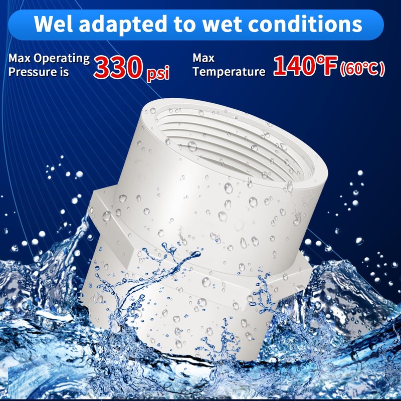 • 【PVC Slip to Female Pipe Fitting】The 3 inch PVC pipe fitting with slip opening on one end and female NPT threads on the other for connecting to pipes with different ends. Max operating pressure is 330 psi, Max temperature is140° F (60° C).