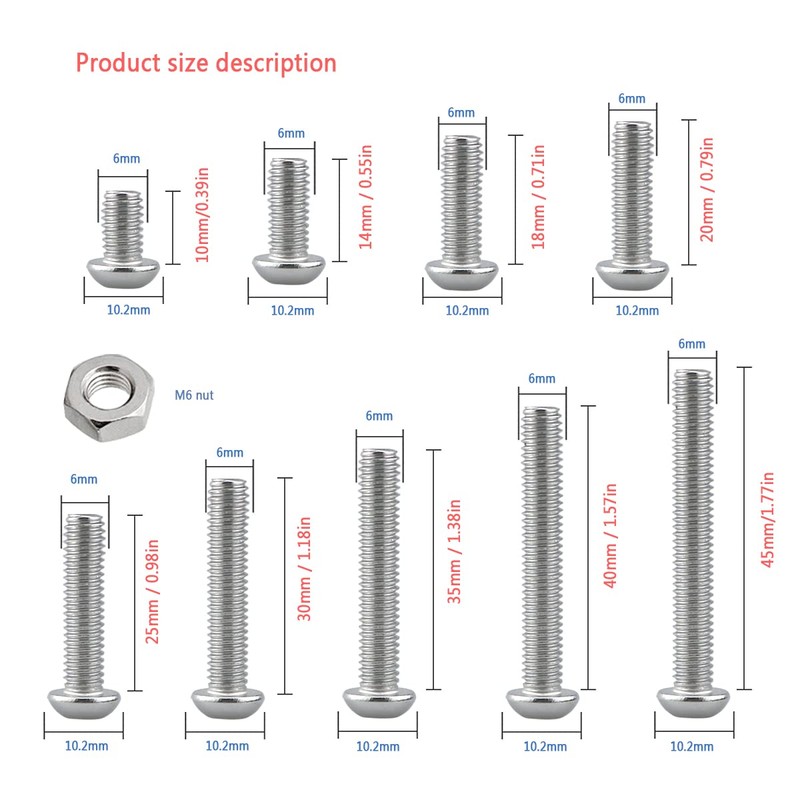 - 【The set contains】: 10 pcs M6*10mm, 10 pcs M6*14mm, 10 pcs M6*18mm, 8 pcs M6*20mm, 8 pcs M6*25mm, 6 pcs M6*30mm, 6 pcs M6*35mm, 6 pcs M6*40mm, 6 pcs M6*45mm, 70 pcs matching M6 nut, a total of 140 pcs M6 hexagon socket bolt and nut set