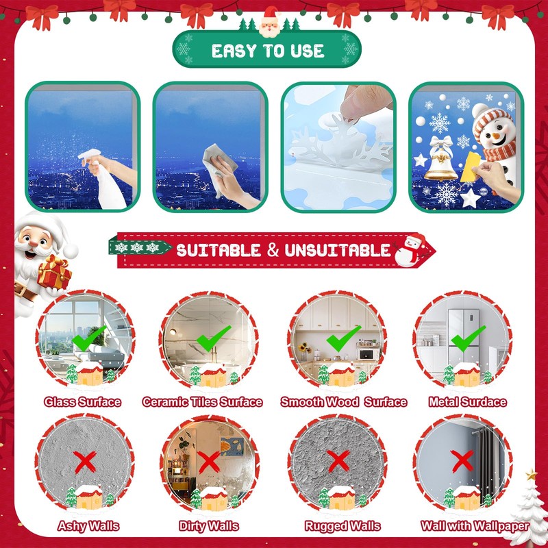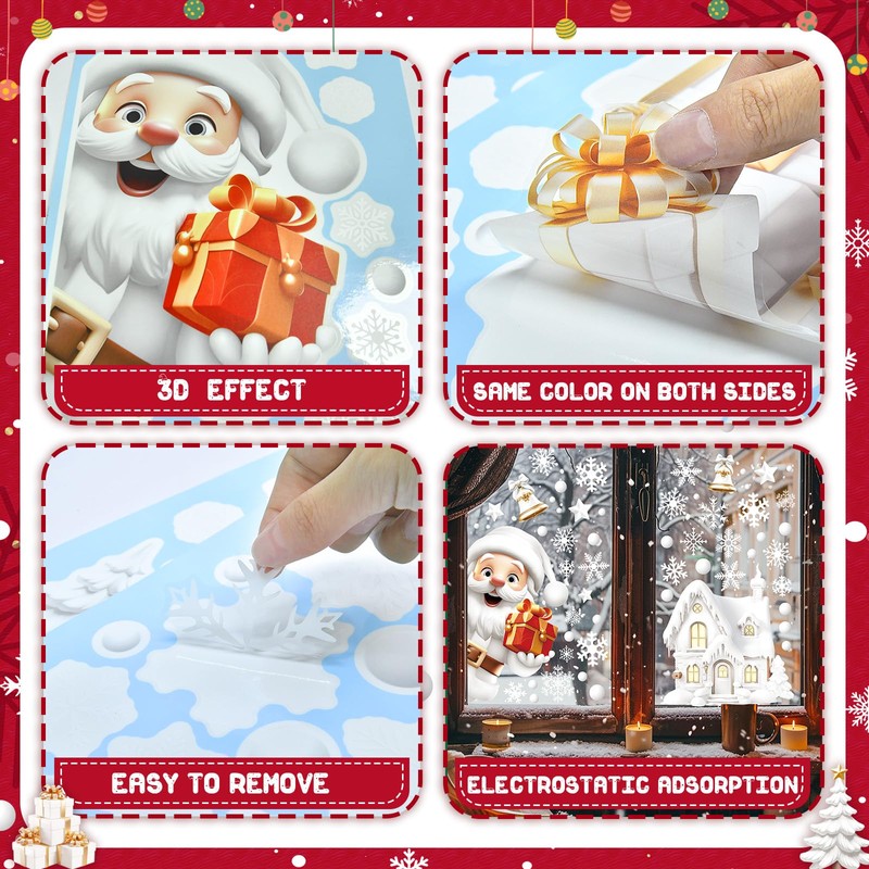 • ⛄【Widely Applicable Scenarios】:Decals Stereo Static Stickers can be decorated in family gatherings, shops, offices, restaurants, etc. to create a Christmas atmosphere. Christmas stickers for windows are suitable for any clean, flat, and smooth surface, such as windows, doors, tiles, refrigerators, glass, mirrors, etc.