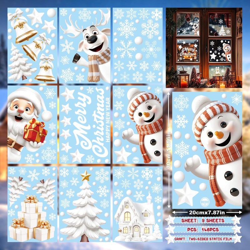 BOLWEO Christmas Window Stickers, 146pcs 9 Sheet Christmas Window Cling,Reusable Double Sided Window Decals Stereo Static Stickers for Christmas Window Decorations