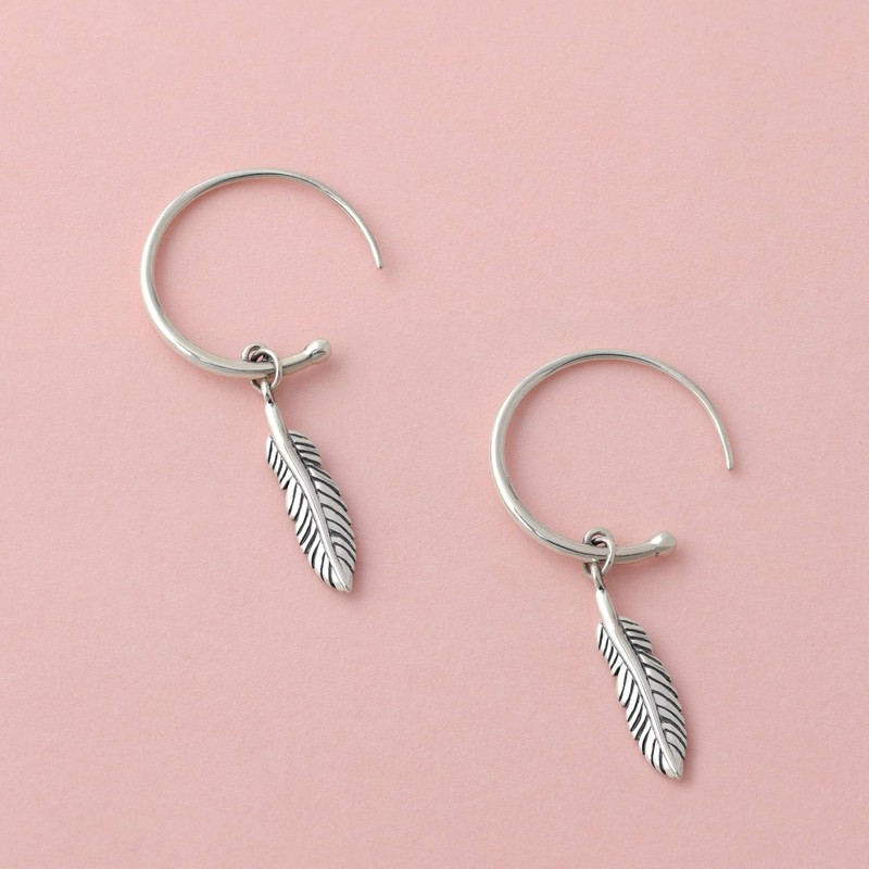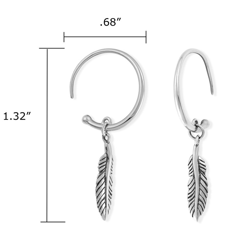 Boma Jewelry Sterling Silver Bohemian Tribal Feather Drop Pull Through Hoop Earrings