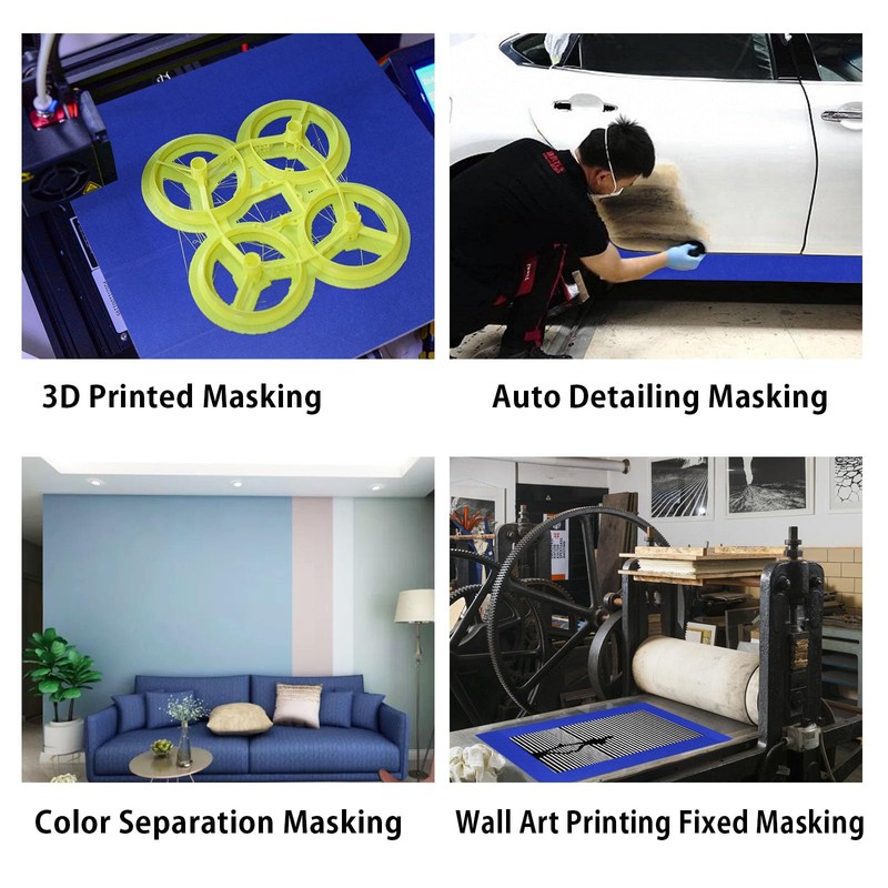 - 3D Printing – Blue painters tape is the preferred use for 3D printing projects. It is simple, cheap and effective. Due to the width of this 6 inch wide blue painters tape, placement and removal are as easy as ever. Stripes of tape can be applied to the build platform surface and easily removed or replaced when ready to do a new project. It adheres well to the print bed and leaves no residues behind