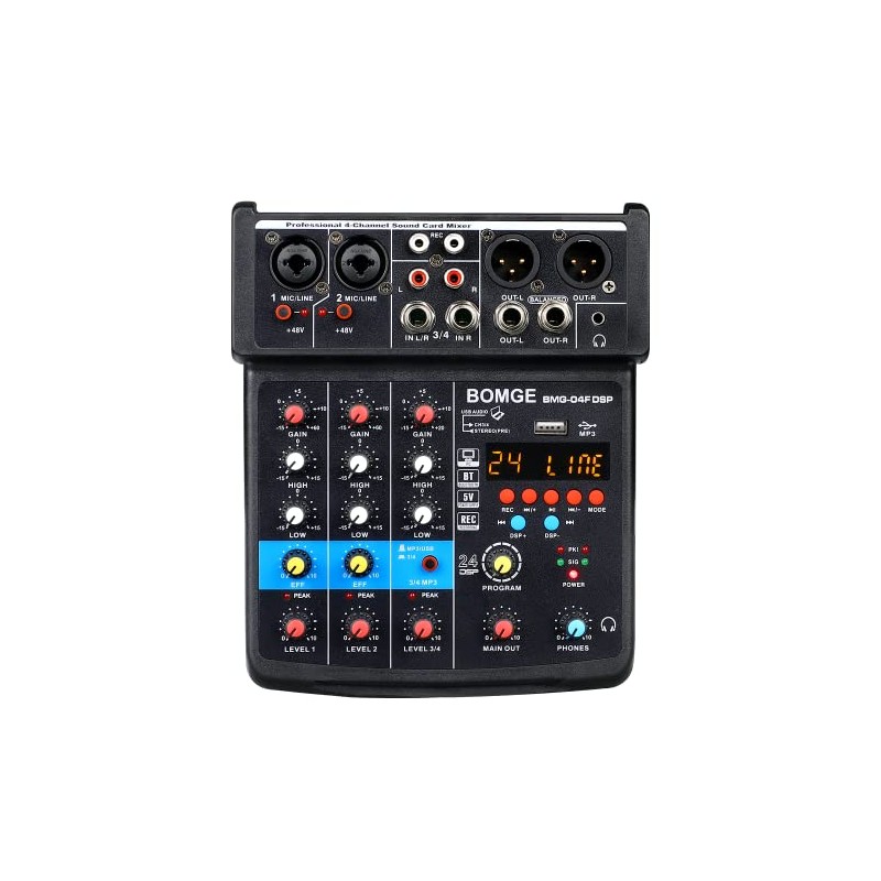 BOMGE 4 Channel mini DJ Audio Sound Mixer Interface with MP3ã USB, Bluetooth , Stereo Recording, 48V Phantom Power, 24 DSP for karaoke, performance, church singing ã podcas streaming