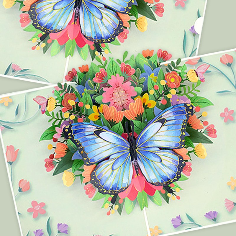 - Open the card, and a delicate butterfly garden blooms before your eyes — vibrant flowers and graceful butterflies rising from the page in a magical dance. This enchanting 3D pop-up design turns an ordinary moment into a breathtaking memory, leaving your loved ones touched and amazed