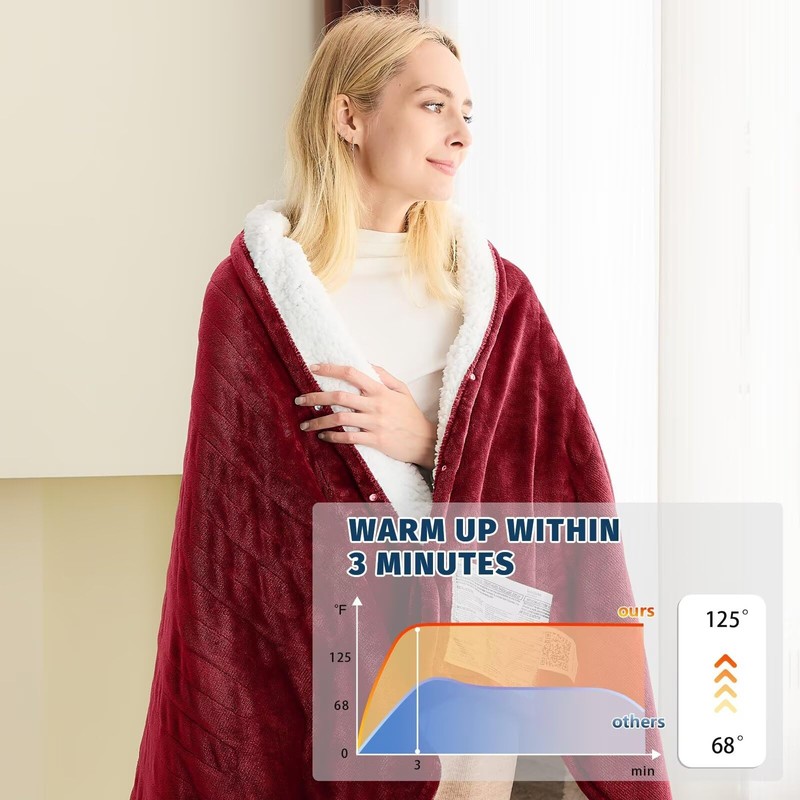 - 【FLEXIBILITY & COMFORT】: Sherpa heated blanket with a 7.87ft power cord gives you more room to move around, no worrying about the distance between the socket and car heated blanket. Electric throw with buttons is suitable for single use, great for keeping a portable heated blanket in place when you drape it over your shoulders as a heated blanket sweater, watching television, reading books, relaxing at home on the couch or sofa; during work on office, bring you a warm and comfortable life.